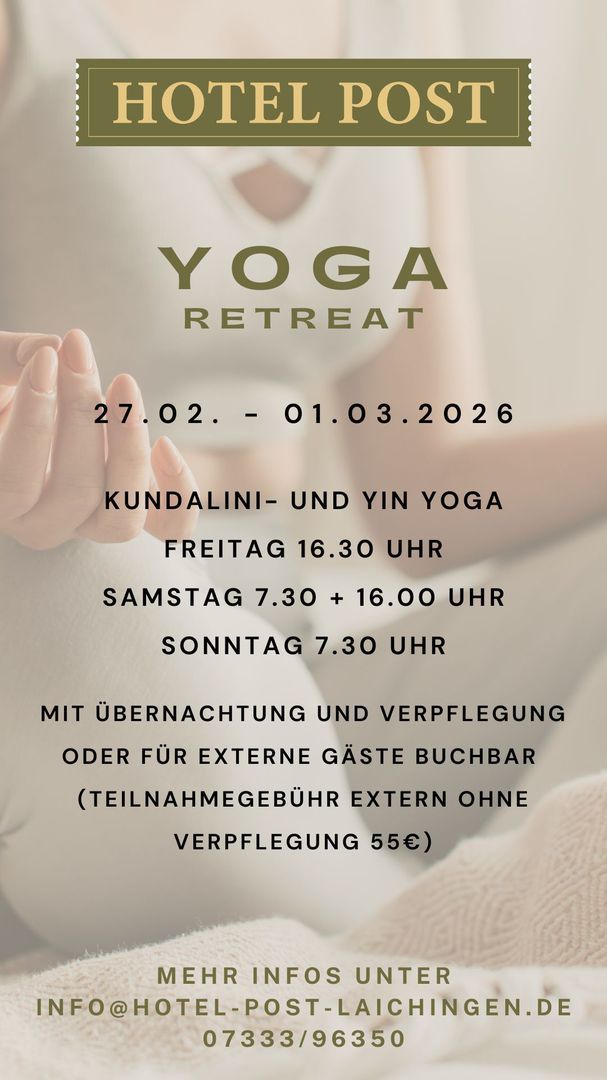 Yoga-Wellness-Wochenende im Hotel Post in Laichingen Feldstetten. Ihr dürft euch auf 4 Yoga Einheiten mit Carina freuen und vorher, nachher, zwischendurch auf wunderbare, regionale Verpflegung, 2 Übernachtungen im Hotel und die hoteleigene Wellness-Oase.